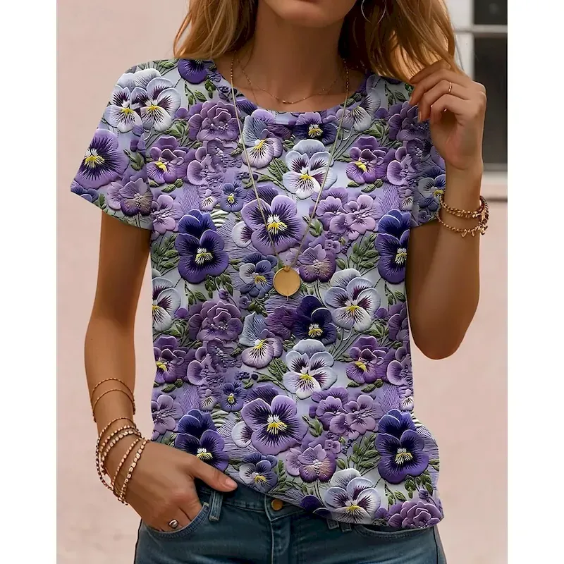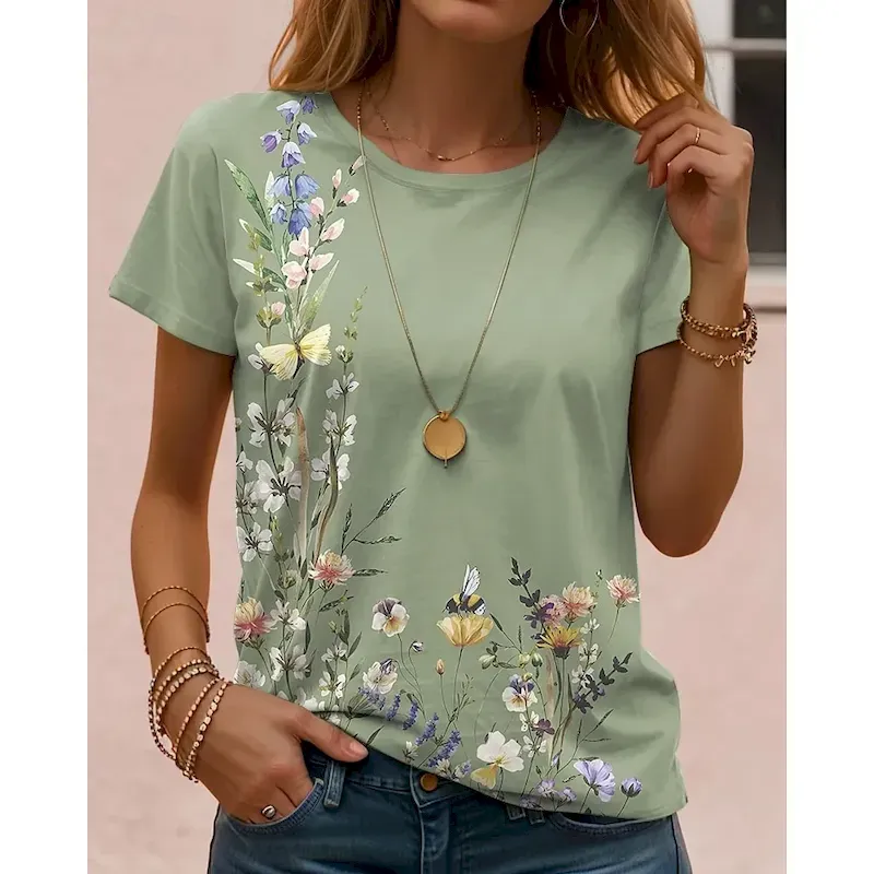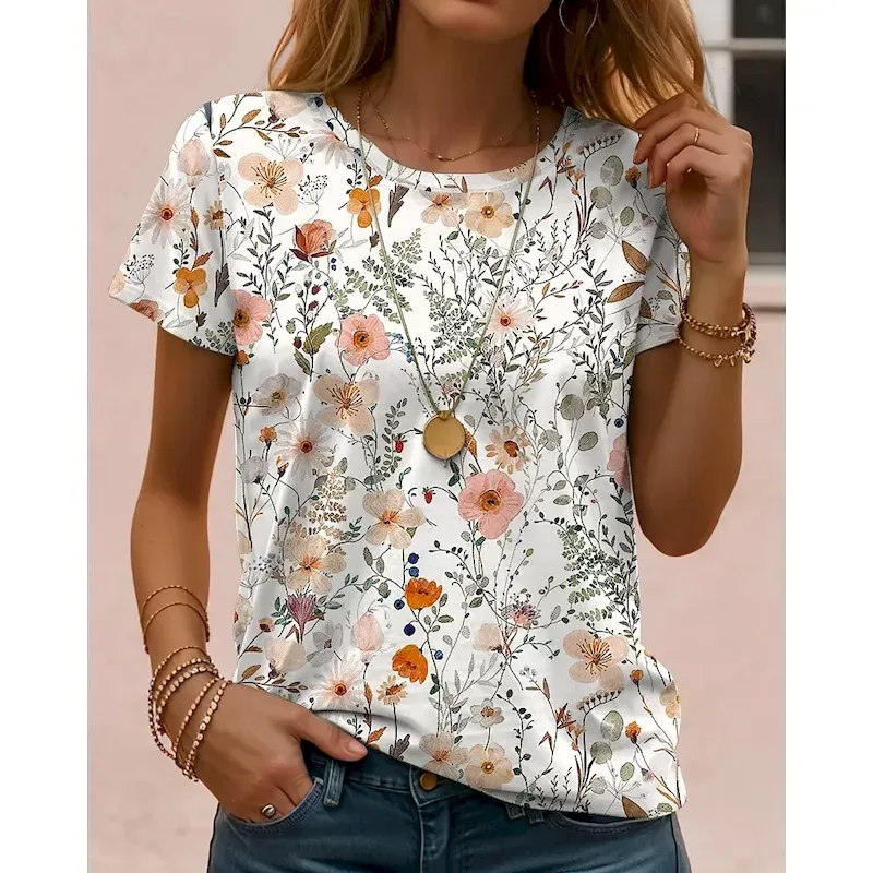 Women’s T Shirt Floral Casual Short Sleeve Round Neck Regular Tops Daily Print White Yellow Pink Purple Green Summer